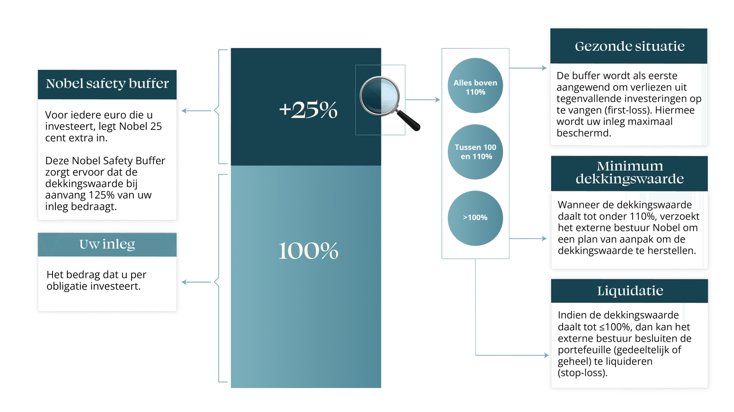 Nobel streeft naar een dekkingswaarde van 125% van uw inleg via onze Nobel Safety Buffer. Voor elke euro die u inlegt, leggen wij er 25 cent bij als extra zekerheid. Eventuele tegenvallers worden eerst door onze buffer opgevangen (first-loss principe). Zo wordt uw inleg optimaal beschermd.